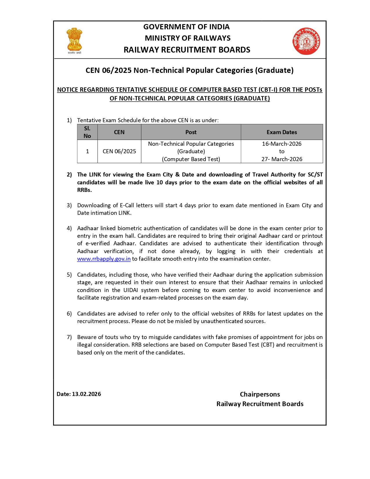 Railway Recruitment Board NTPC Graduate Level Admit Cards Issued vide Advertiement Number 06/2025. All those candidates who have aplied for the recruitment can download admit cards for exam entrance hall. Application already started for this recruitment from 21-10-2025 to 27-11-2025 for 5810 posts. Interested candidates who are goining to take part in this exam can now download admit cards from below or from directly official website also from below link. RRB Admit Cards Released 2026.