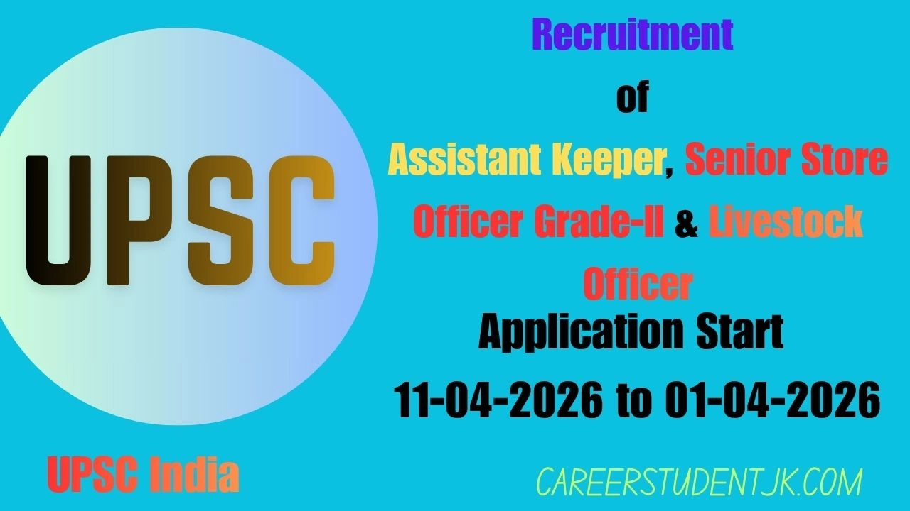 Union Public Service Commission Of india released advertiseemnt notification for online job application for 16 posts Anthropology Survey of India (Ministry of Culture), DRDO & Animal Husbandry Dairying. Vide Advertisement Notification Number 02/2026. Interested candidates can apply for this recruitment from given proper dates that is the application start from 11th of April 2026 and last is 1st May 2026 April 2026 for the posts os Assistant Keeper, Senior Store Officer Grade-II & Livestock Officer. Interested candidates can visit official website and download full notification and read line by line and page by page before going online process. Eligibile candidate6s can apply online on the official website of UPSC but before this application online process candidates are requested check all eligibility criteria, age imit, application fee, application dates, category wise fee, total posts, examination details, admit card, syllabus and all other information are given in the advertisement recruitment notification. UPSC Recruitment 2026.